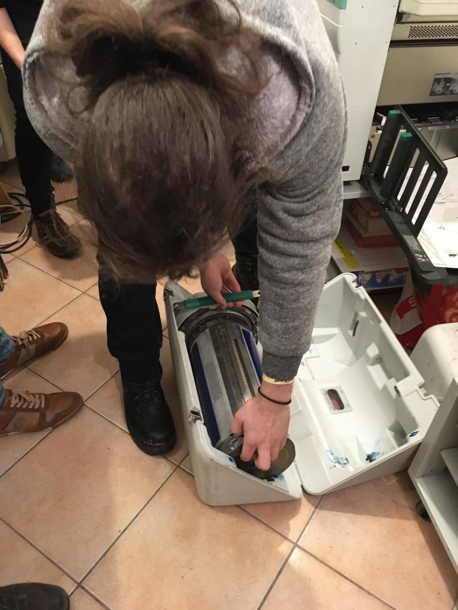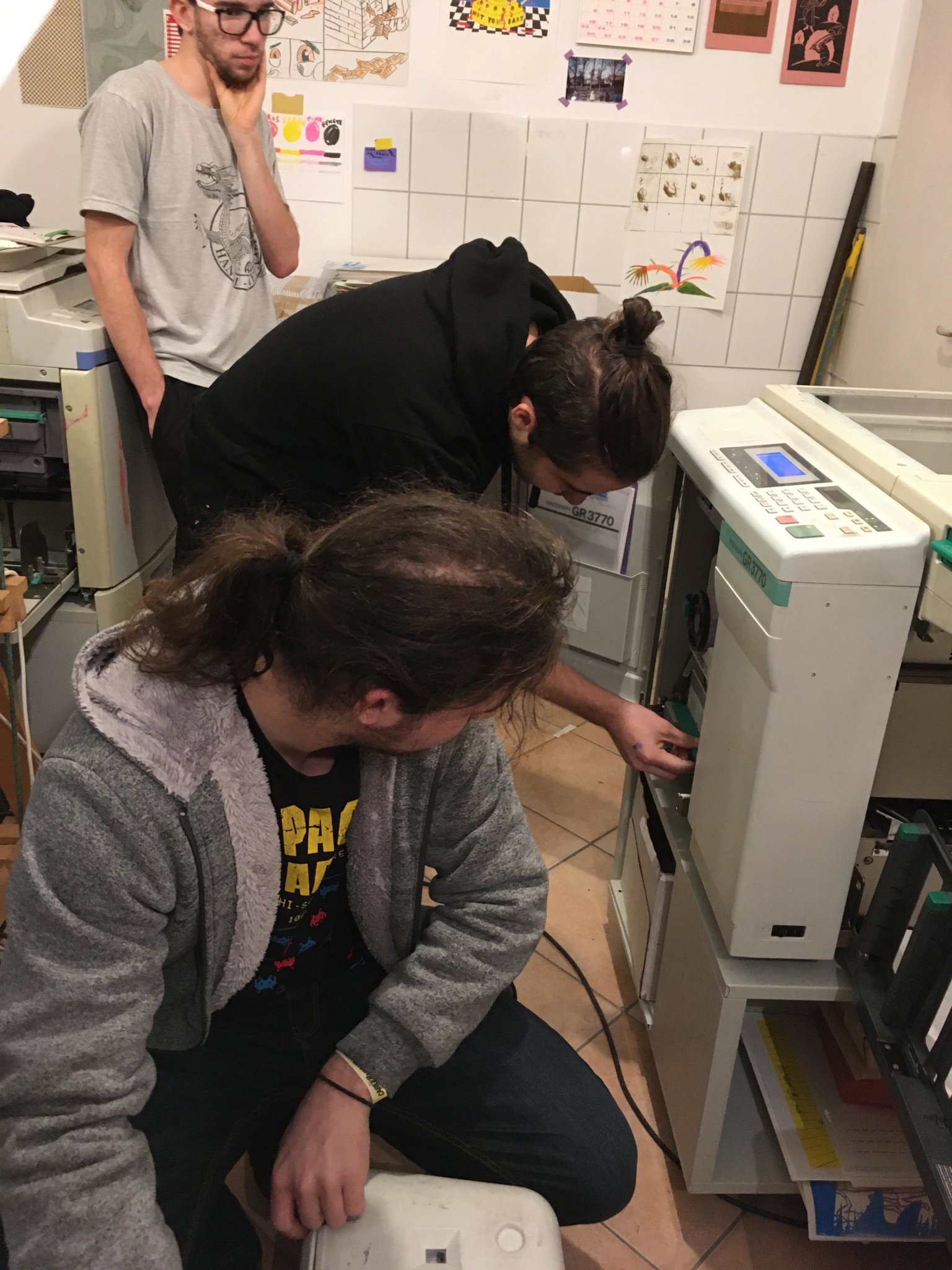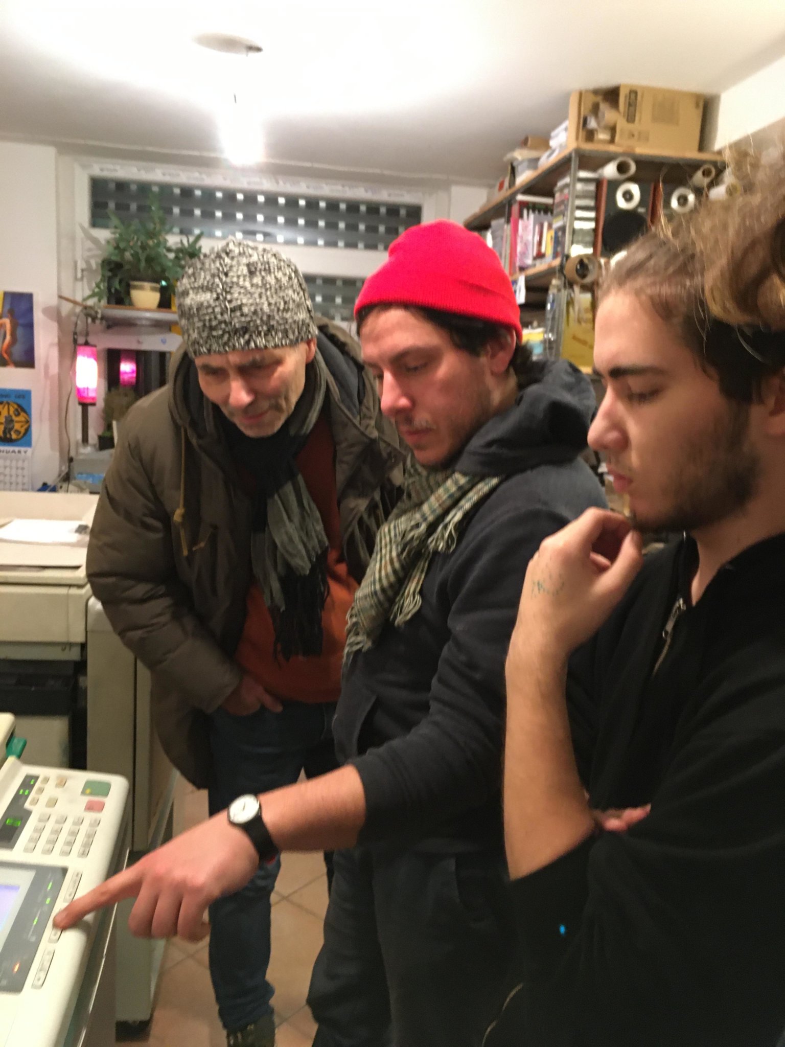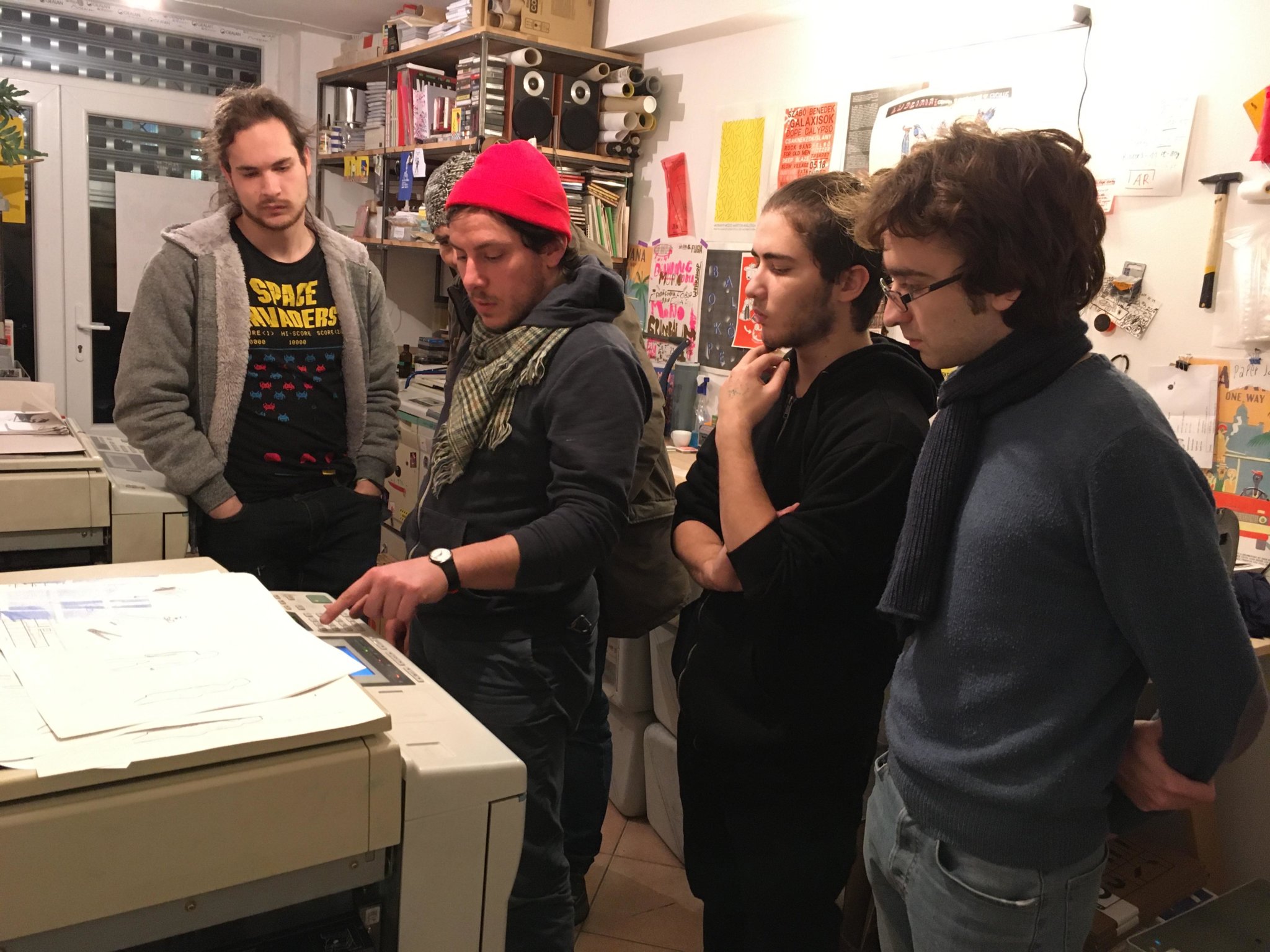 Öten, Lutz Bogi, Németh Ágoston, Csörgits Máté, Gombás András és Horváth Barnabás egy vidám hangulatú 3 órás workshopon elsajátitották a rizográfos nyomtatás alapvető fogásait és gyakorlatban is kipróbálták, hogyan is megy mindez.